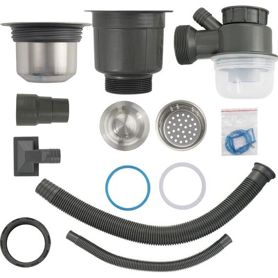 Сифон для кухонных моек, цвет хром, матовый, с диаметром сливного отверстия 90 мм, бутылочного типа с переливом и со сьёмной корзинкой для мусора. С разборным выпуском и нержавеющей решеткой с гофрой, из высокопрочного пластика АБС с затвором от проникновения запахов. Форма сифона позволяет поддерживать хорошую пропускную способность слива сточной воды, выполняя свою главную функцию - формирование гидрозатвора для отсечения неприятных запахов из канализации. Конструкция позволяет легко, без демонтажа, снять отстойник (стакан) и почистить сифон в случае засорения, достать случайно упавшие в слив раковины мелкие ценные вещи. Сифон прост в установке. Габаритные размеры: высота стакана 220 мм, гофра 650 мм, верхняя крышка 110 мм. Комплект: сифон, гофра, перелив, уплотнения. Вес - 0,500 кг, объём - 0,01080 м3.