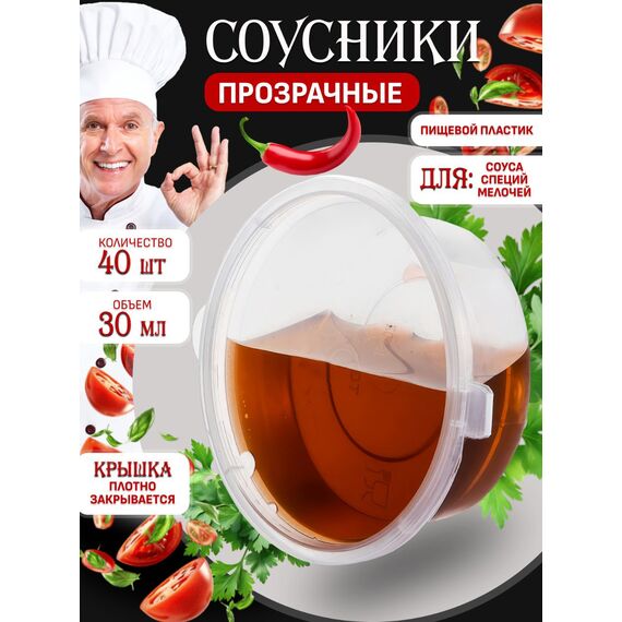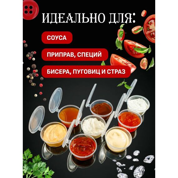 Удобный соусник с герметичной крышкой для порционной упаковки Представляем вам практичные соусники объемом 30 мл с плотно закрывающейся внутренней крышкой. Они идеально подходят для фасовки соусов, джемов, меда, сметаны, васаби, имбиря, а также для пробников косметики и других продуктов. Герметичная крышка предотвращает протекание и сохраняет свежесть содержимого. Прозрачный материал позволяет легко видеть продукт. Соусники выполнены из прочного пищевого полипропилена (ПП), безопасного для контакта с продуктами.
