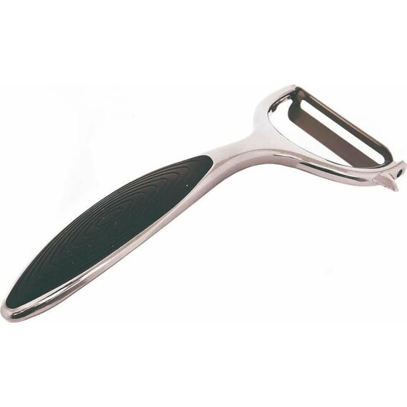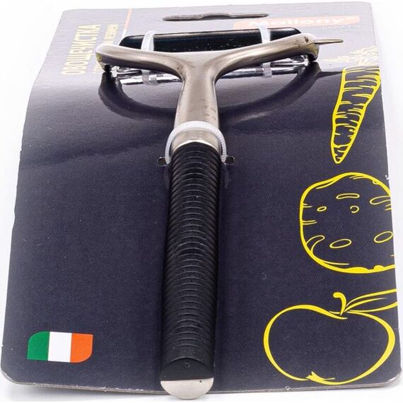 Овощечистка с горизонтальным лезвием серии Eletto Материал: сплав цинка, никелированный с вставками из ABS пластика. Размеры: 15*6.5*2 см. Длина лезвия - 6 см Вес - 63 грамма. Упаковка: цветная подложка, крепеж из пластика, пузырчатая пленка.