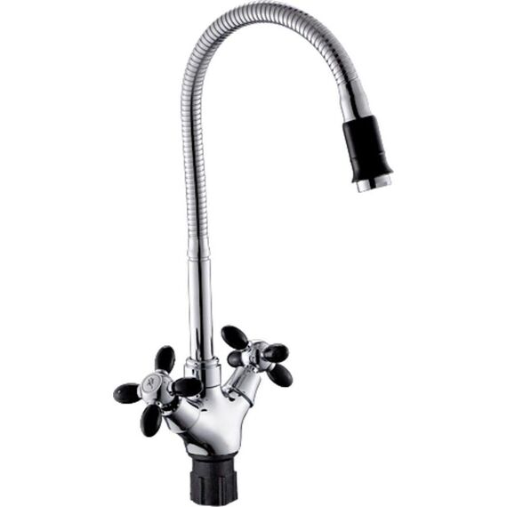Смеситель для кухни с гибким изливом (крепление гайка) - Покрытие корпуса: хром - Цвет излива: черный - Кран-букса латунная с керамическими пластинами (угол поворота 90 градусов) - Гибкая подводка 1/2" дюйма (400 мм)