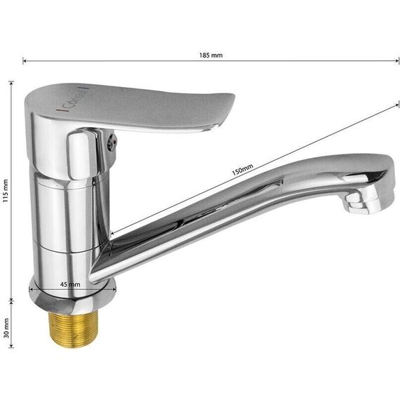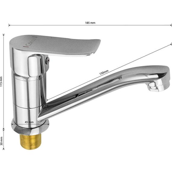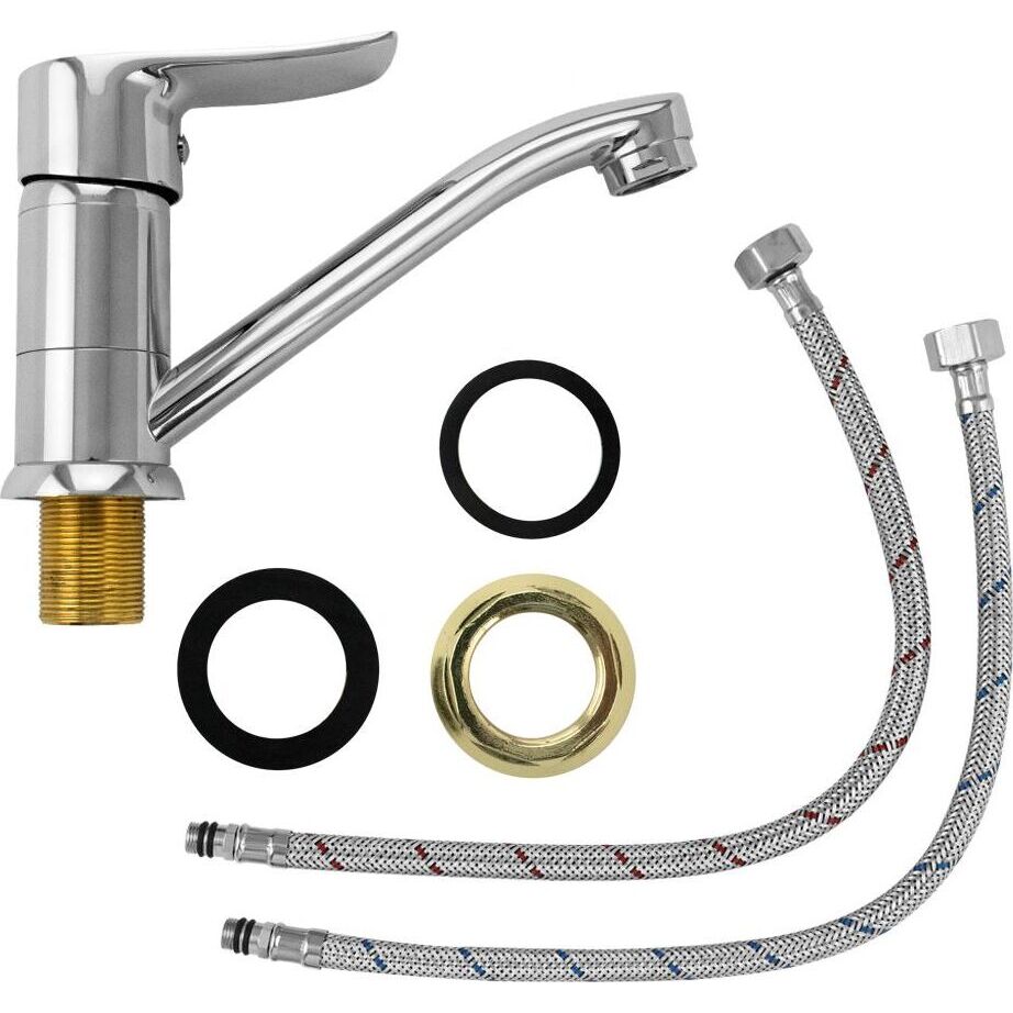 Смеситель для кухонной мойки и раковины, хромированный, с коротким, поворотным изливом, шаровый, литая ручка. Материал изготовления — ЦАМ (цинк-алюминий-медь). Крепление резьба - гайка, картридж d = 35 мм. Аэратор для экономии воды. Габаритные размеры: высота 115 мм, длина 185 мм, длина излива 150 мм, диаметр посадочного седла 45 мм, длина резьбы 30 мм, длина подводки 400 мм. Вес - 1,000 кг, объём - 0,00350 м3. В комплекте паспорт, корпус, подводка 1/2, крепеж, набор прокладок.