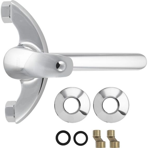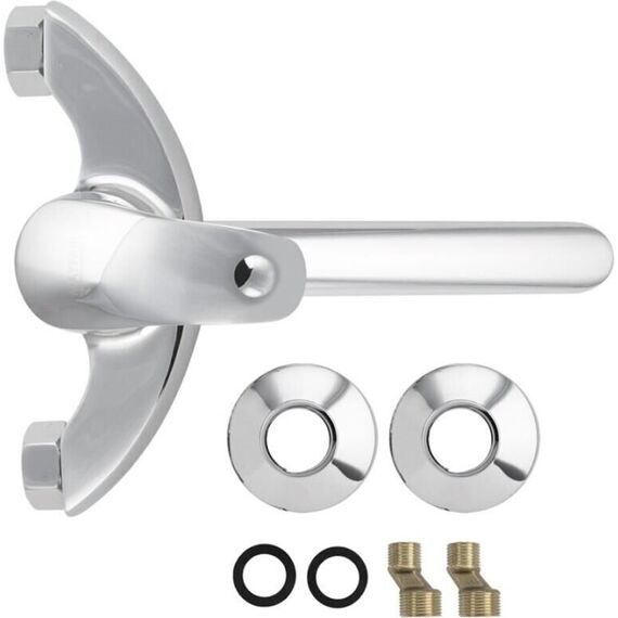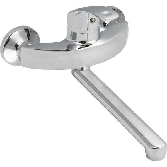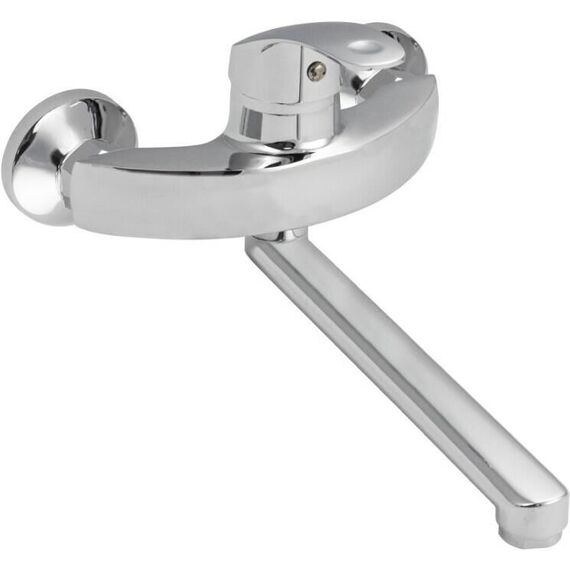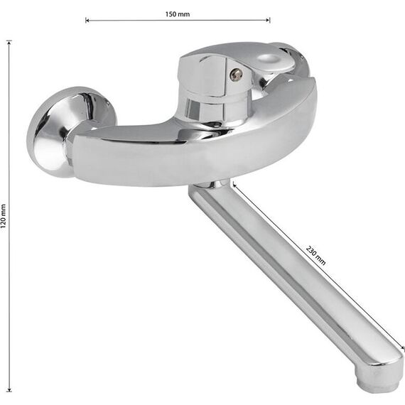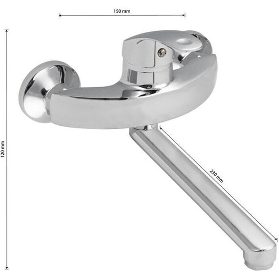 Смеситель от стены, для кухонной мойки и раковин, хромированный, изогнутый дутый корпус, шаровый, с плоским изливом, аэратором для экономии воды, картридж d = 40 мм, ручка литая. Материал изготовления — ЦАМ (цинк-алюминий-медь) + нержавеющая сталь. Габаритные размеры: ширина 150 мм, высота 120 мм, длина излива 230 мм, диаметр чашки 65 мм. Вес - 1,000 кг, объём - 0,00377 м3. В комплекте корпус с изливом, паспорт, крепёж.