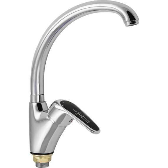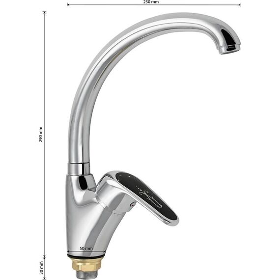Смеситель для кухонной мойки и раковин, корпус хромированный, боковой, с высоким С-образным изливом, шаровый. Материал изготовления — ЦАМ (цинк-алюминий-медь) + нержавеющая сталь. Крепление резьба - гайка, картридж d = 40 мм, черная ручка с узором. Аэратор для экономии воды. Габаритные размеры: высота 290 мм, длина 250 мм, диаметр посадочного седла 50 мм, длина резьбы 30 мм, длина подводки 400 мм. Вес - 1,250 кг, объём - 0,00500 м3. В комплекте паспорт, корпус с изливом, подводка 1/2, крепеж, набор прокладок.