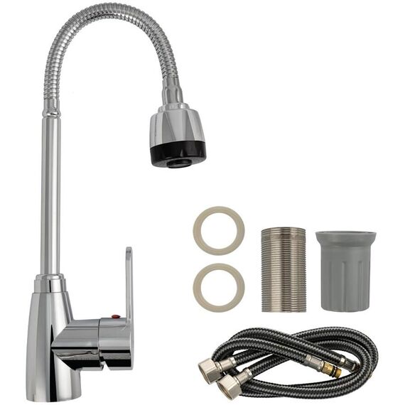 Смеситель для кухонной мойки и раковин, из высокопрочного пластика АБС, хромированный, боковой, с гибким изливом,с большим двухрежимным аэратором, шаровый. Крепление резьба - гайка, картридж d = мм, литая ручка. Хромированный аэратор для экономии воды. Габаритные размеры: высота 360 мм, длина 160 мм, диаметр посадочного седла 50 мм, длина резьбы 60 мм, длина подводки 450 мм. Вес - 0.71 кг, объём - 0.00385 м3. В комплекте паспорт, корпус с изливом, пластиковая подводка с латунными штуцерами 1/2, крепеж, набор прокладок.