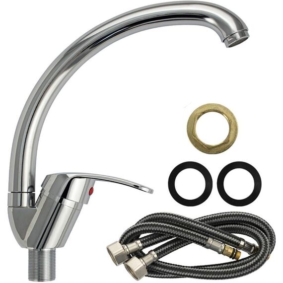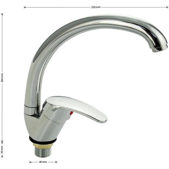 Смеситель для кухонной мойки и раковин, литой хромированный корпус, из нержавеющей стали и аллюминия, с С - образным изливом, шаровый,Цвет хром. Крепление резьба - гайка, картридж d = мм, ручка литая. Аэратор для экономии воды. Такая модель может использоваться на домашней кухне, на даче, в медицинских учреждениях и общественных местах. Габаритные размеры: высота 260 мм, длина 250 мм, диаметр посадочного седла 40 мм, длина резьбы 30 мм, длина подводки 400 мм. Вес - 0,65 кг, объём - 0,00357 м3. В комплекте паспорт, корпус с изливом, подводка 1/2, крепеж, набор прокладок.