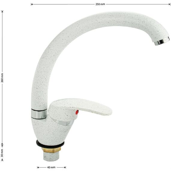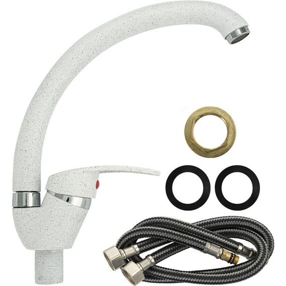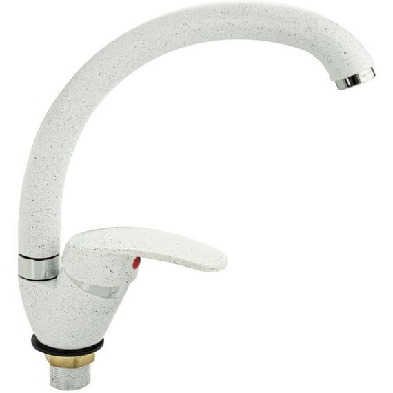 Смеситель для кухонной мойки и раковин, литой матовый корпус, из нержавеющей стали и аллюминия, с С - образным изливом, шаровый. Цвет белая эмаль с вкраплениями. Крепление резьба - гайка, картридж d = мм, ручка литая. Аэратор для экономии воды. Такая модель может использоваться на домашней кухне, на даче, в медицинских учреждениях и общественных местах. Габаритные размеры: высота 260 мм, длина 250 мм, диаметр посадочного седла 40 мм, длина резьбы 30 мм, длина подводки 400 мм. Вес - 0,65 кг, объём - 0,00357 м3. В комплекте паспорт, корпус с изливом, подводка 1/2, крепеж, набор прокладок.