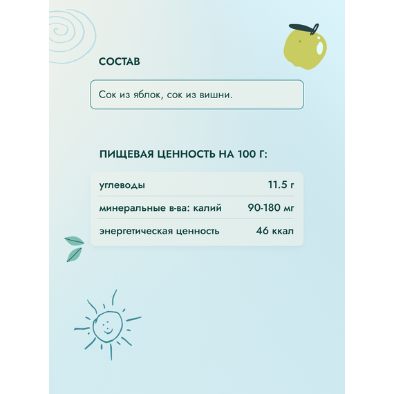 Сок «ФрутоНяня» из яблока и вишни осветленный — отличный способ познакомить малыша старше 5 месяцев с новыми вкусами. В его составе только на 100% натуральные ингредиенты. Яблочно-вишневый сок «ФрутоНяня» — отличный способ разнообразить привычное меню ребенка и зарядить его дополнительной энергией!